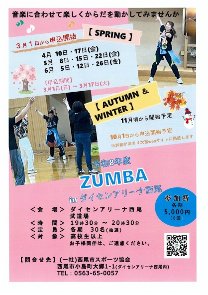 【スポーツ教室】ズンバ 〔SPRING〕参加者募集 申込場所 下記の参加申込フォームのみ 申込開始日 2026年3月01日 申込締切日 2026年3月17日 ズンバ〔SPRING〕 申込多数の場合は、抽選となります。 後日、参加申込者全員に書面で通知いたします。 参加申込フォーム 申込フォーム内にメールアドレスを入力してください。(必須) 必要項目入力後、【送信内容の確認へ】→ 内容を確認後【送信】へお進みください。 参加申込内容の確認メールが送信されます。(「nishio-sport.jp」 のドメインを受信できるよう設定をお願いします。)