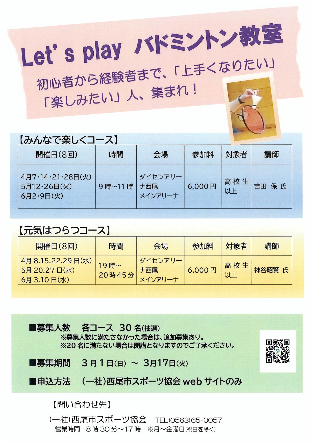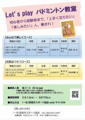 【スポーツ教室】Let's play バドミントン教室 参加者募集 申込場所 下記の参加申込フォームのみ 申込開始日 2026年3月01日 申込締切日 2026年3月17日 みんなで楽しくコース(火曜日) 元気はつらつコース(水曜日) 申込多数の場合は、抽選となります。 後日、参加申込者全員に書面で通知いたします。 ※各コースとも20名に満たない場合は閉講となりますのでご了承ください。 参加申込フォーム 申込フォーム内にメールアドレスを入力してください。(必須) 必要項目入力後、【送信内容の確認へ】→ 内容を確認後【送信】へお進みください。 参加申込内容の確認メールが送信されます。(「nishio-sport.jp」 のドメインを受信できるよう設定をお願いします。)