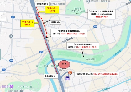 その他の駐車場:古川緑地中央付近駐車場(約60台) ※古川緑地西駐車場は関係者のみ